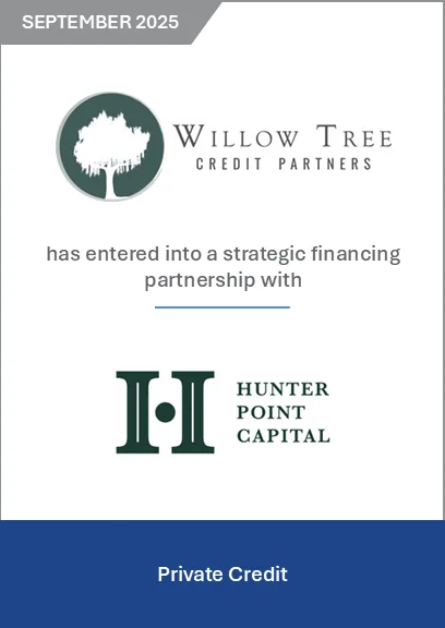 Willow Tree Credit Partners (Willow Tree) has entered into a strategic financing partnership with Hunter Point Capital (HPC). Willow Tree provides flexible capital structure solutions for sponsor-backed and non-sponsored middle market businesses. Within its suite of solutions, HPC offers non-dilutive financings to support the capital needs of GPs and their private investment funds. In the past year, HPC has executed ten such financing transactions across the platform.