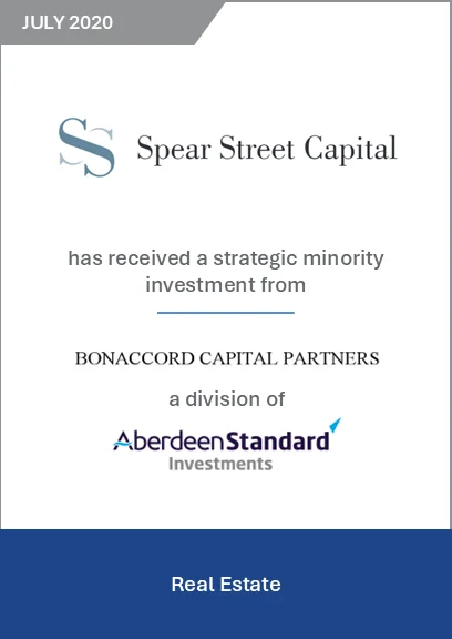 Spear Street Capital LLC, an owner and operator of office properties located in the United States, Canada and Europe, has received a strategic investment from Bonaccord Capital Partners, a division of Aberdeen Standard Investments. Pursuant to the transaction, Bonaccord acquired a passive, non-voting minority interest and will provide capital to support the future growth of the firm. The transaction will have no impact on the day-to-day management or operations of Spear Street. Terms of the transaction were not disclosed.